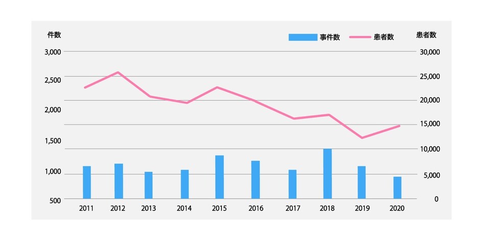 多少の増減はありますが、年間約1,000件発生しています。患者数は近年約15,000人となっています。