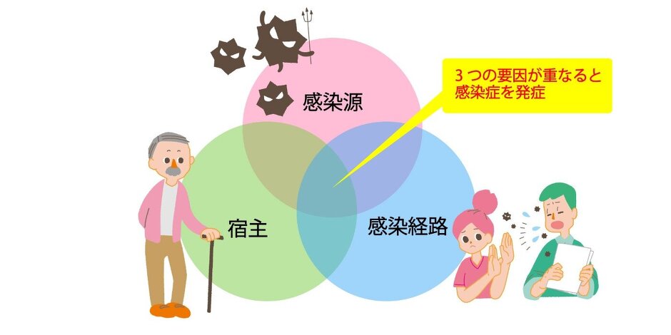 感染とは、環境中に存在する様々な微生物のうち、病気の原因となるウイルスや細菌、真菌(カビ)などが、宿主*となるヒトや動物の体内に入り、臓器や組織で増殖することです。その結果、発熱や下痢などの症状が出ることを感染症と言います。感染しても、必ずしも症状が出るとは限りません(保菌状態)。また、健康なヒト(宿主)に対しては病原性を発揮しない病原体が、抵抗力が弱っている時に病原性を発揮しておこる感染を、日和見感染と言います。 感染が成立するには、原因となる病原体の存在(感染源)、その感染症を引き起こす可能性を持つヒトの存在(宿主)、そして病原体が宿主に入り込むための経路(感染経路)の3つの因子が必要です。そのため、感染予防には、これらを排除することが重要です。 *宿主:ウイルスや細菌、真菌などが寄生する相手の生物