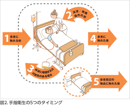 「医療における手指衛生に関するWHOガイドライン2009」では、患者ケアにおける手指衛生のポイントを5つのタイミングとして具体的に示しています。