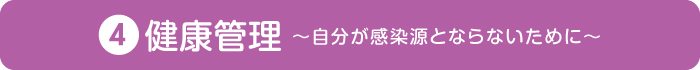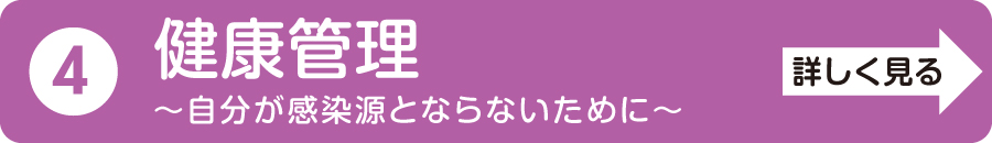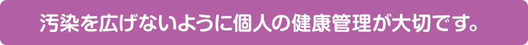 ノロウイルスの施設への持込みや汚染拡大を防ぐためには、一人ひとりの健康管理がとても重要です。自分自身が感染源とならないために生活環境においてノロウイルスに感染しないという自覚を持つことが重要です。