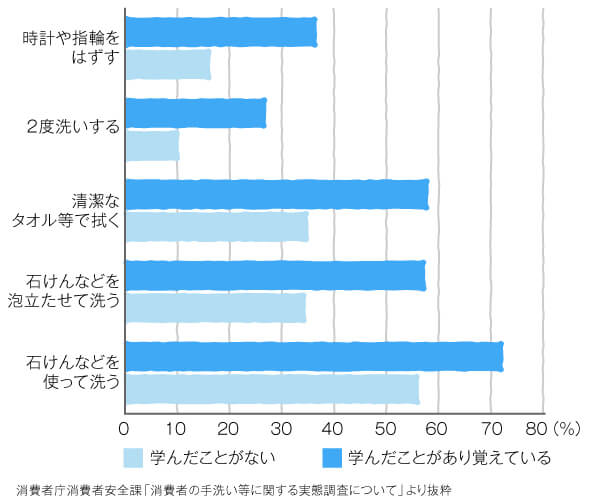 事実、教育を受けて手順どおりに手洗いを行った場合では、手洗いにおける洗浄率が高く、洗浄の出来栄えにばらつきが生じないという結果があります。また、手洗いの教育を受けることによって、さまざまな手洗いに対する意識が向上するというアンケート結果もあります。