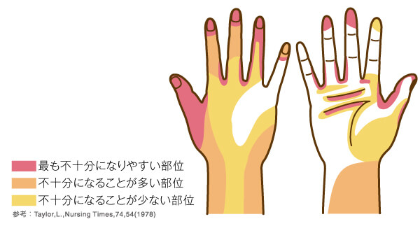 手洗いするときを思い浮かべてみましょう。手の平は一生懸命洗う人が多いかもしませんが、指先、親指、指の間、手首などは不十分になりやすいです。また、きき手は洗い残しが多くなるので、気をつけましょう。