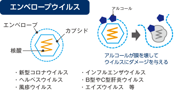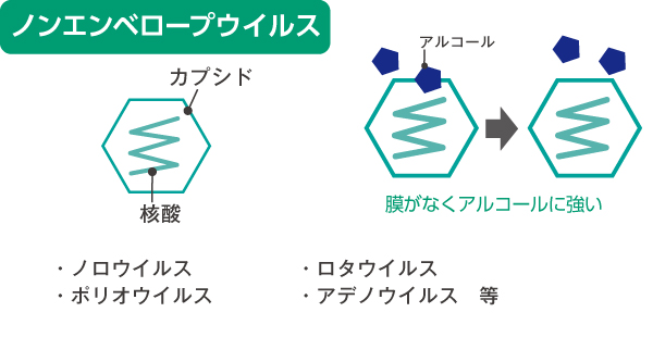 エンベロープのあるウイルスはアルコール消毒剤が効果的なのに対し、エンベロープのないウイルス(ノンエンベロープウイルス)は、アルコール消毒剤が一般的に効きにくい傾向にあります。