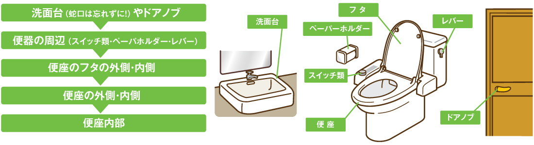 例えばトイレの清掃では便器だけでなくドアノブやペーパータオルホルダー、洗面所など全体を清掃することが重要です。清掃や除菌を行う際は、汚染が少ないと思われる箇所から順に行いましょう。