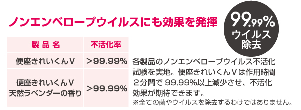 中性で手肌にやさしく、便座材質への影響にも配慮。さらに、ノンエンベロープウイルスにも効果がある便座除菌クリーナーです。